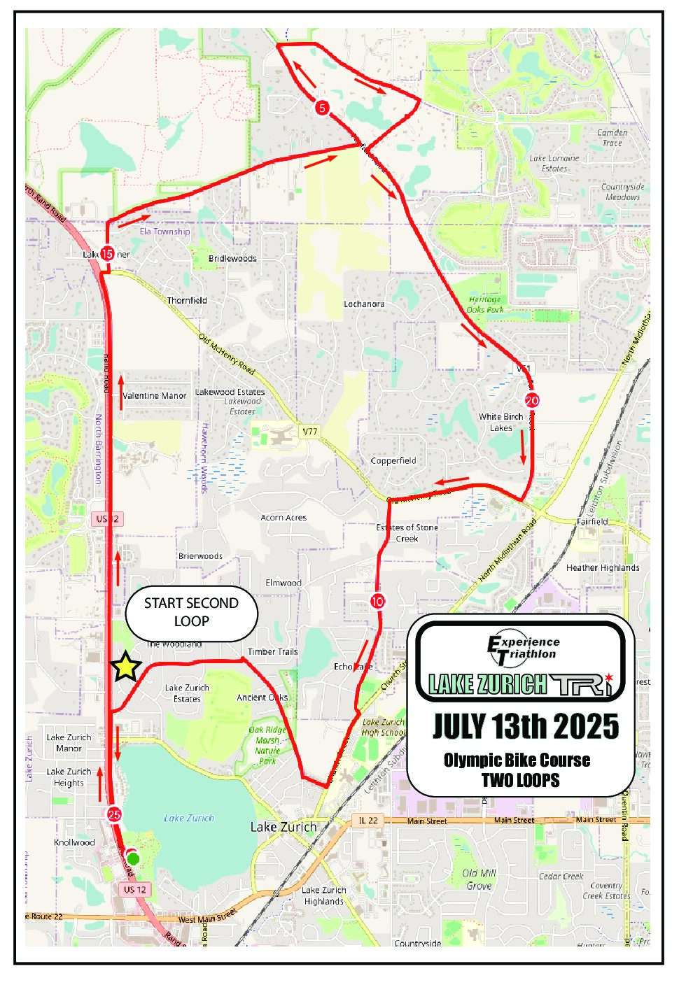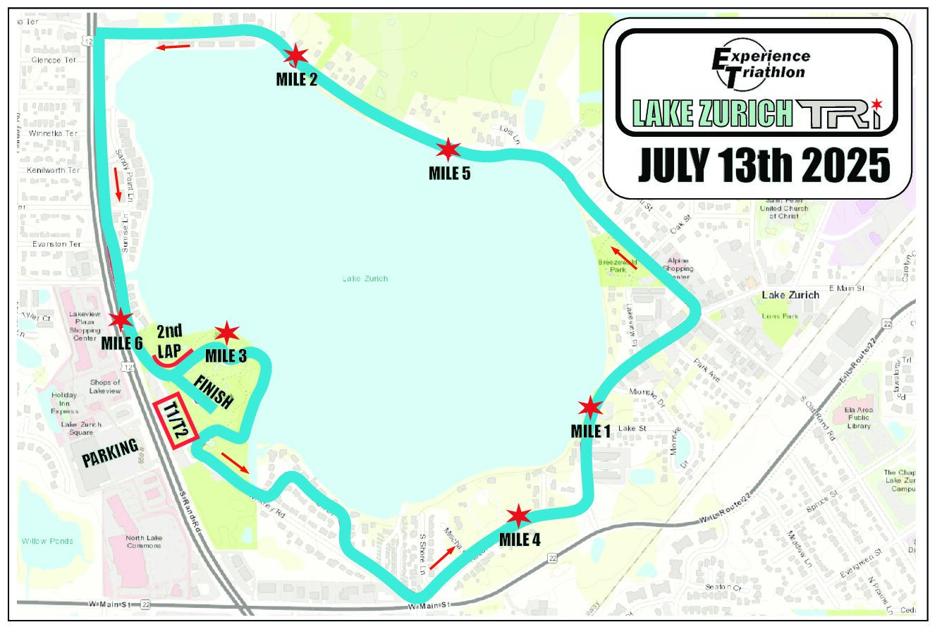 The Lake Zurich Olympic Triathlon race course offers competitors with a 1500 meter swim. The event also offers a 2 loop Bike Course in the communities surrounding the park. Finally, athletes will run a 5K two loop course around the lake and neighborhoods surrounding the finish line at Paulus Park.