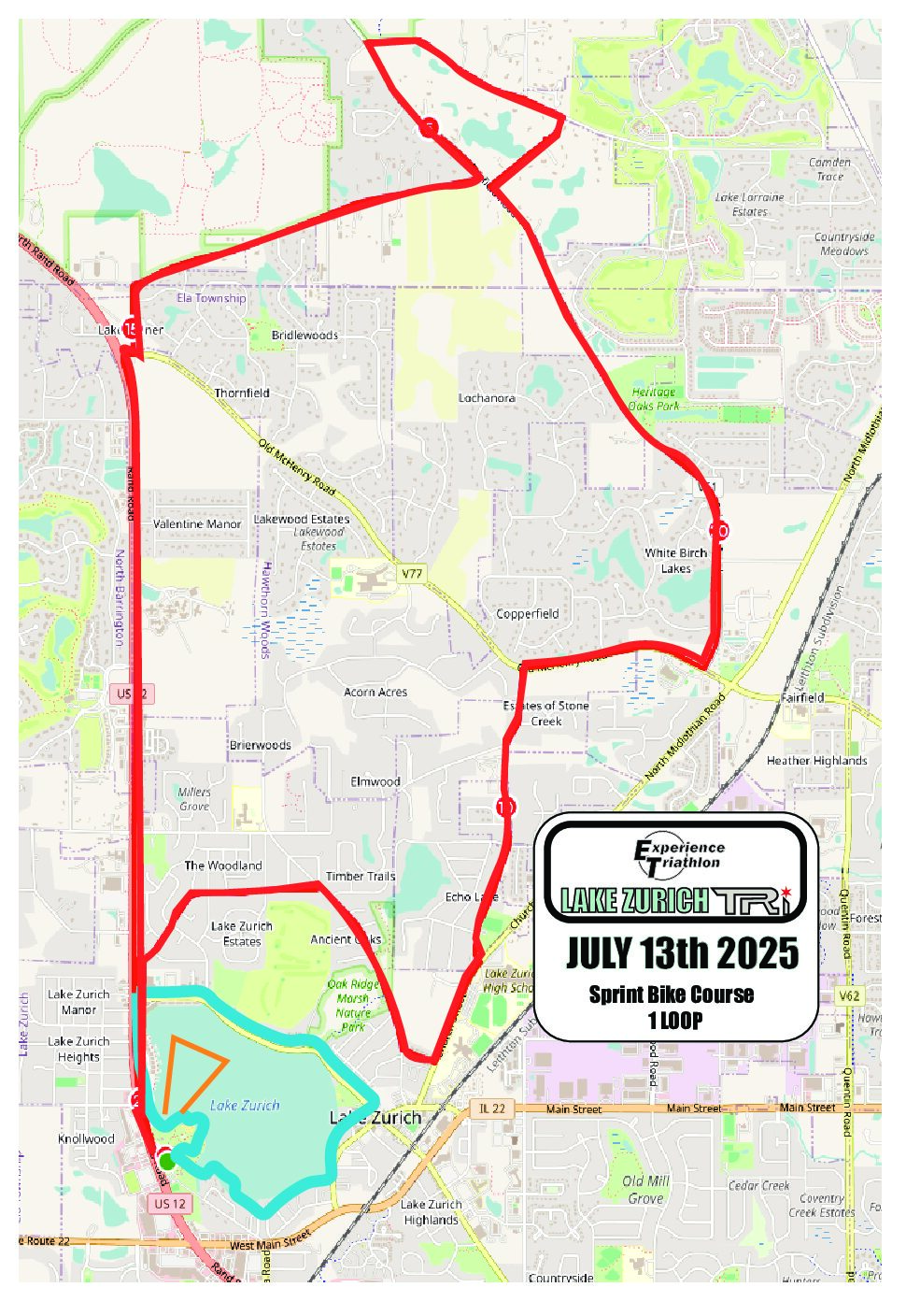 The Lake Zurich Sprint Triathlon race course offers competitors with a 750 meter swim. The event also offers a 1 loop Bike Course in the communities surrounding the park. Finally, athletes will run a 5K loop course around the lake and neighborhoods surrounding the finish line at Paulus Park.